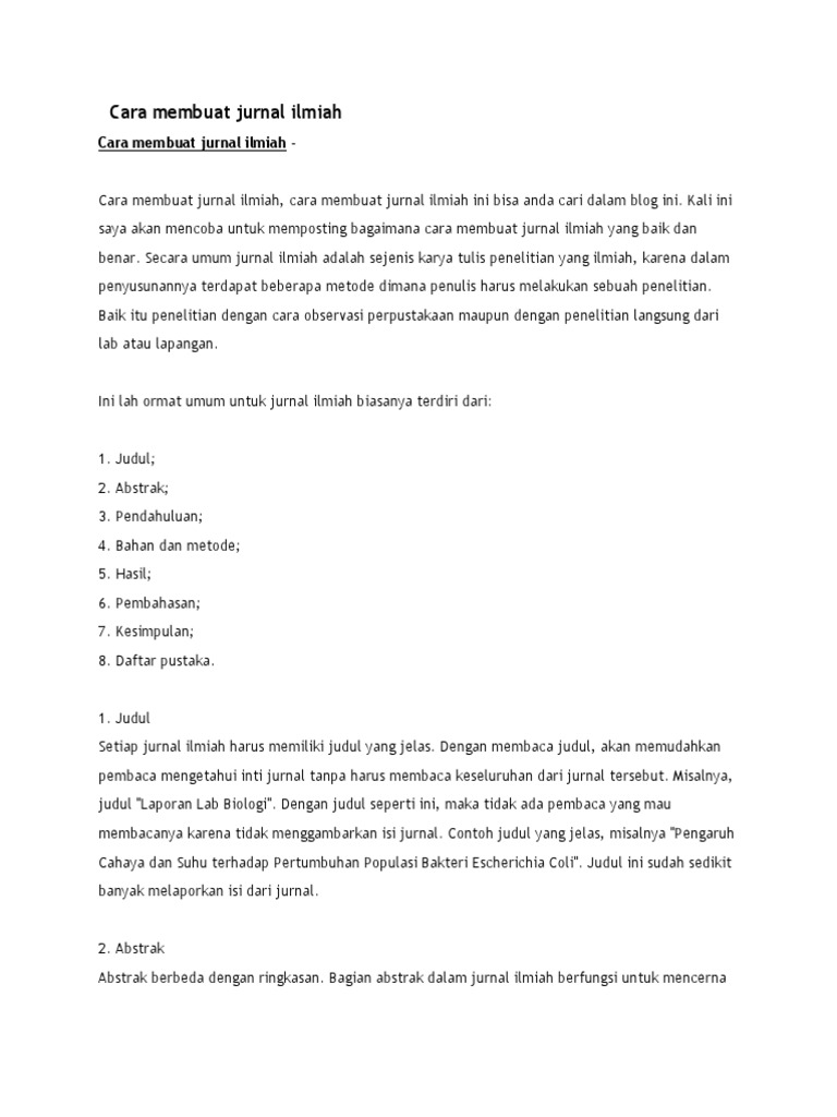 Biasanya bagian abstrak ditaruh sebagai paragraf paling awal dari suatu paper penelitian untuk memudahkan pembaca memahami konteks hasil riset secara keseluruhan. Struktur artikel ilmiah hasil penelitian terdiri atas 10 bagian utama yaitu. Sedangkan jurnal ilmiah atau scholarly journal umumnya digunakan sebagai bahan pengembangan keilmuan setelah melewati beragam penelitian.