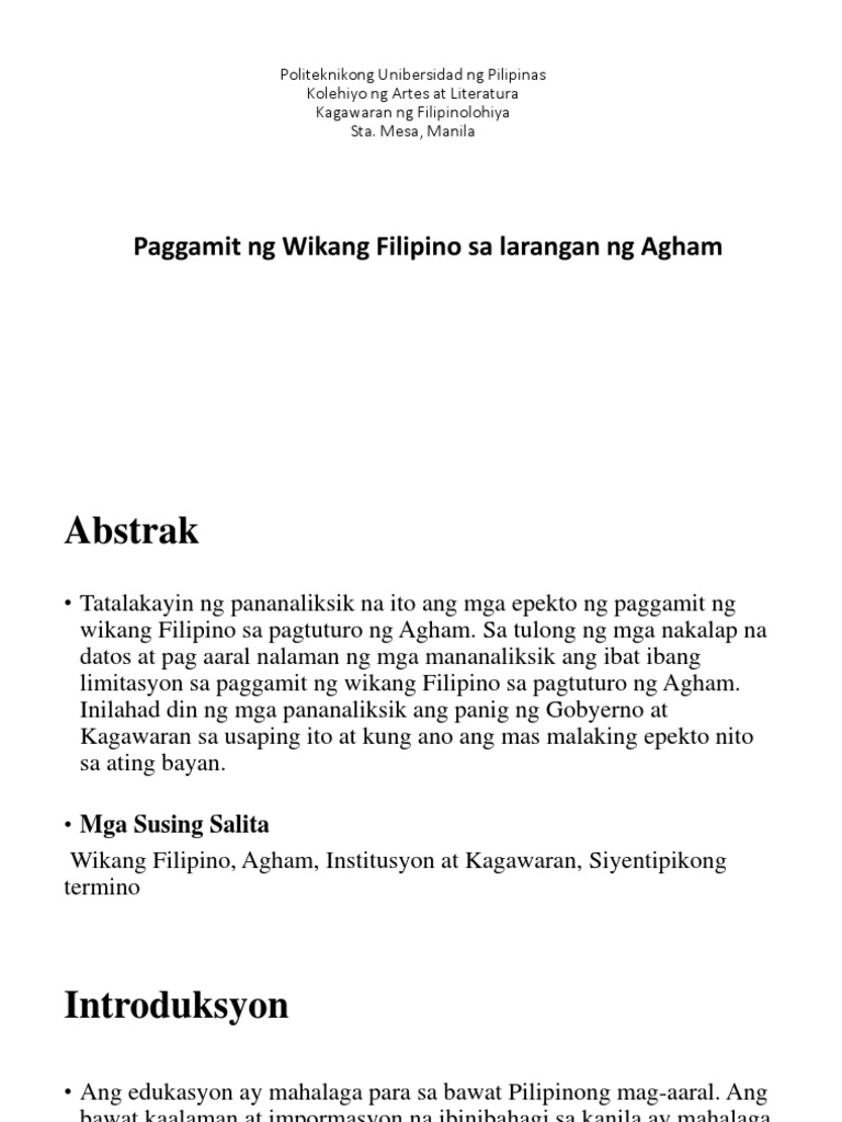 Halimbawa ng abstrak. ANG WIKANG FILIPINO SA MAKABAGONG PANAHON Ipiniprisinta kay. Kahit na noong nagkaroon ng direktiba ang DECS tungkol sa angkop na midyum para sa pagtuturo ng ibat ibang asignatura Ingles pa rin ang napiling midyum para sa pagtuturo ng matematiks.
