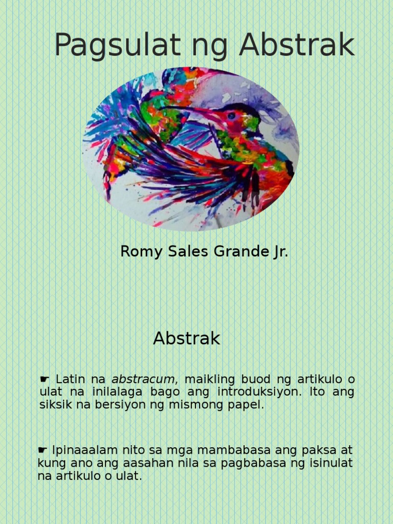 Mahalagang may malawak na kaalaman sa larangan o disiplinang napili na. Hindi maaring maglagay ng mga datos na hindi naman binanggit sa ginawang pananaliksik o sulatin at ang tanging nakalahad lamang ay ang mga pangunahing konsepto at kaisipang sa komprehensibong pamamaraan upang lubos na. Ang abstrak ay mula sa salitang Latin na abstractus na nangangahulugang drawn away o extract from Harper 2016.