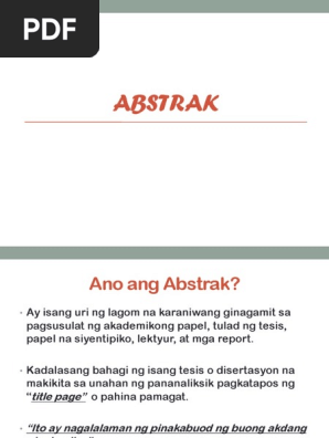 Ilahad ang mga impormasyon gamit ang sariling salita 3. Ito ay kadalasang bahagi ng isang tesis o disertasyon na makikita sa unahan ng pananaliksik pagkatapos ng title. ABSTRAK Karaniwan ang abstrak ay nagpapaliwanag tungkol sa kung ANO ang pag-aaral na isinagawa BAKIT isinagawa ang pag-aaral PAANO isinagawa ang pag-aaral ANO ang mga nakalap na impormasyon at PALIWANAG kung bakit mahalaga ang naisagawang pag aaral Stand alone document - ibig sabihin ay hindi na kailangang tingnan pa o basahing muli ang laman ng teksto upang maunawaan ang sulatin sa pamamagitan pa lamang ng pagbasa sa abstrak ay mauunawaan na ang kabuuan ng pag-aaral na.