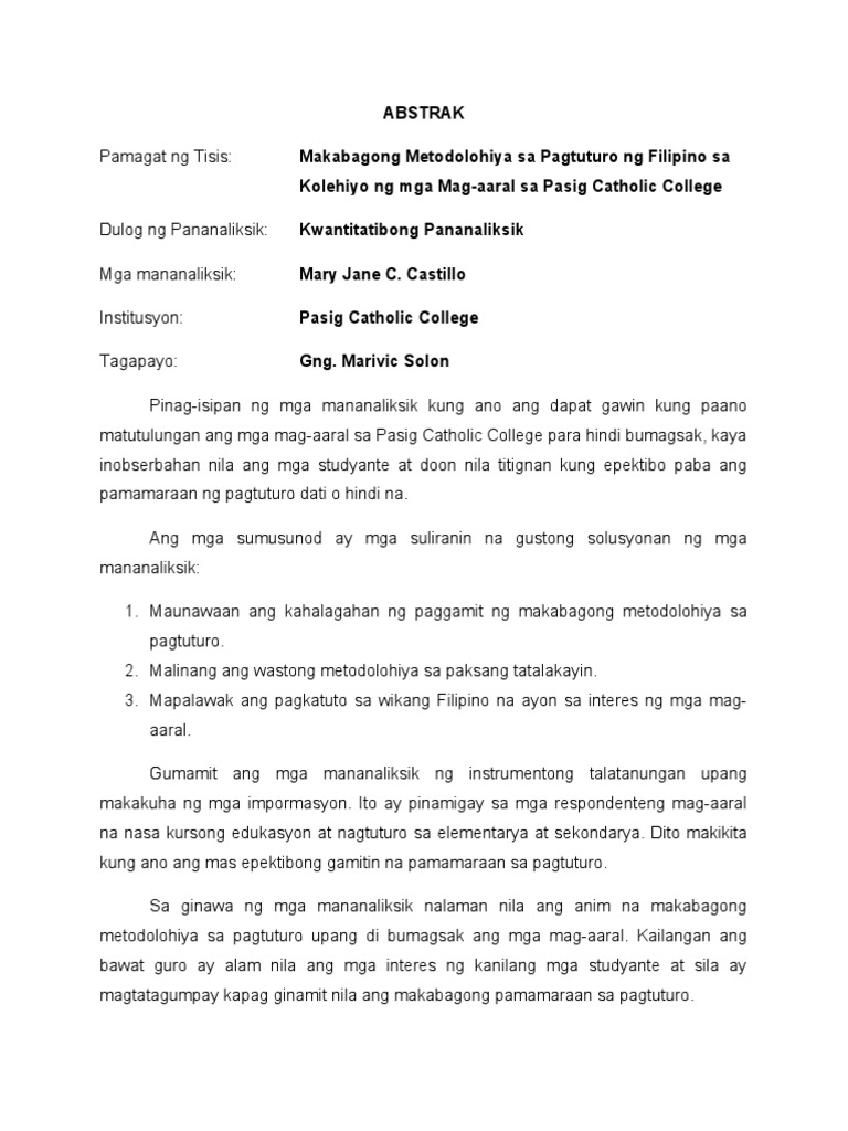 Doc Makabagong Metodolohiya Sa Pagtuturo Ng Filipino Sa Kolehiyong Mga Mag Aaral Sa Pasig Catholic College Arjay Quizon Academia Edu