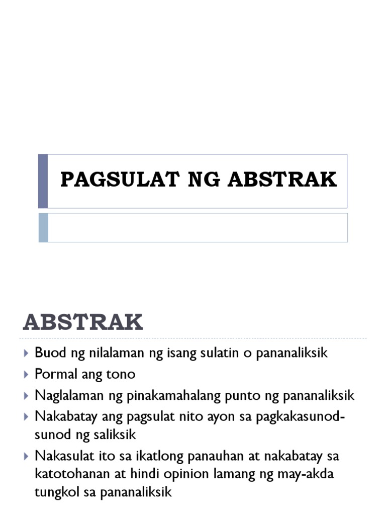Heto ang mga elemento na napapaloob sa isang abstrak. Mga hakbang sa pagsulat ng abstrak 1. Alam mo ba kung saan nagmula ang salitang abstrak abstract at kung ano ang ibig sabihin nito.