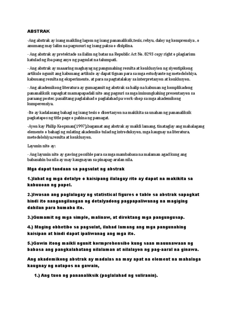 Mahalagang tandaan na sa pamamagitan ng abstrak malalaman na ng. Paikliin o mas gawing payak ang impormasyon ng bawat seksyon sa isa o dalawang pangungusap. Akademikong Pagsulat ng Abstrak Ang abstrak ay salitang ginagamit upang ilarawan ang mga sulatin na may ugnayan sa akademiko tulad ng thesis scientific papers o research papers at iba.