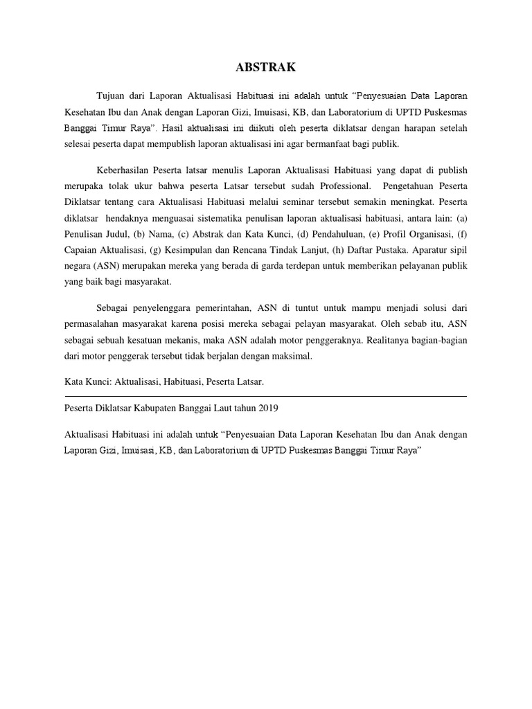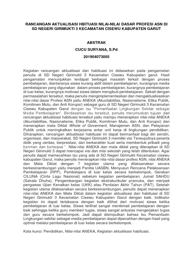 Namun sebagian orang mengalami kesulitan dalam menulis abstrak. RANCANGAN AKTUALISASI HBITUASI NILAI-NILAI DASAR PROFESI ASN DI. Laporan Aktualisasi Nilai Dasar Akuntabilitas Nasionalisme Etika Publik Komitmen Mutu Anti Korupsi Profesi PNS Prajabatan Gol III Pemkot Salatiga pada Dinas Kesehatan Kota Salatiga.