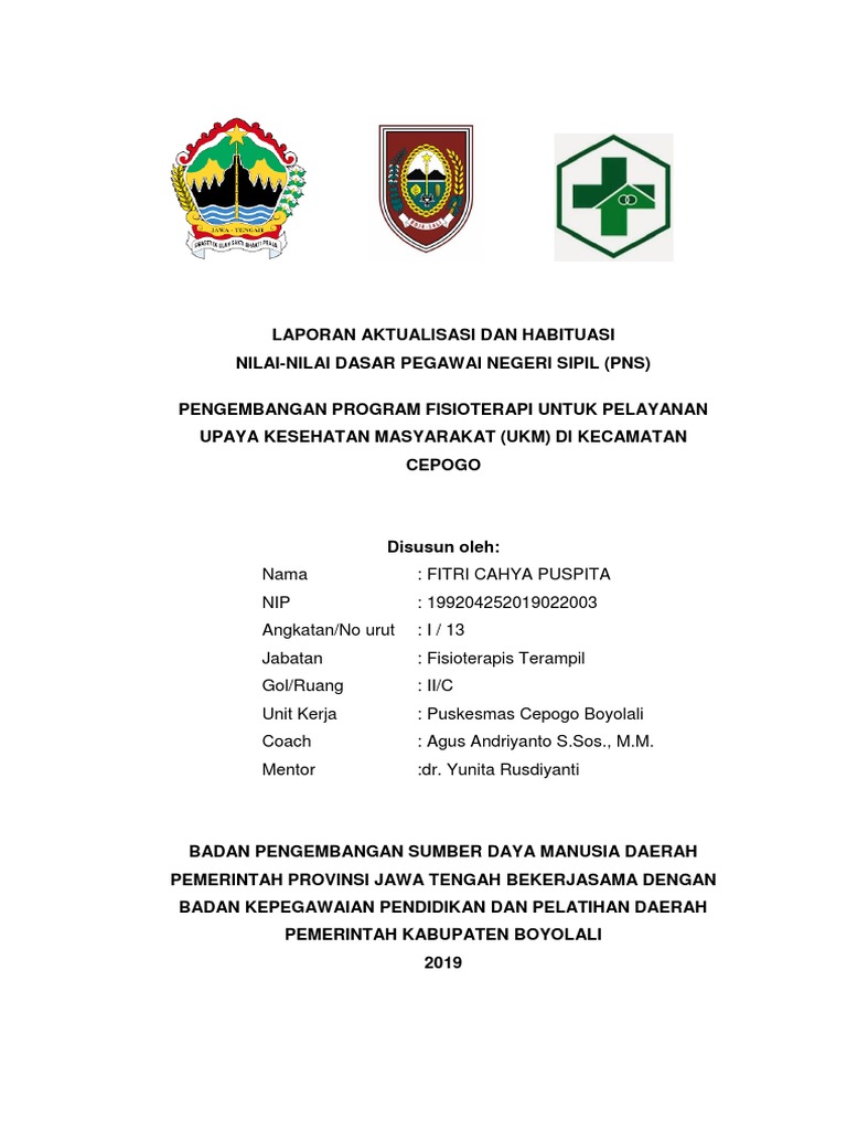 LAPORAN AKTUALISASI DAN HABITUASI NILAI-NILAI DASAR PEGAWAI NEGERI SIPIL PNS PENGEMBANGAN PROGRAM FISIOTERAPI UNTUK PELAYANAN UPAYA KESEHATAN MASYARAKAT UKM DI KECAMATAN CEPOGO. 26 badan kepegawaian dan pengembangan. SD NEGERI GIRIMUKTI 3 KECAMATAN CISEWU KABUPATEN GARUT.
