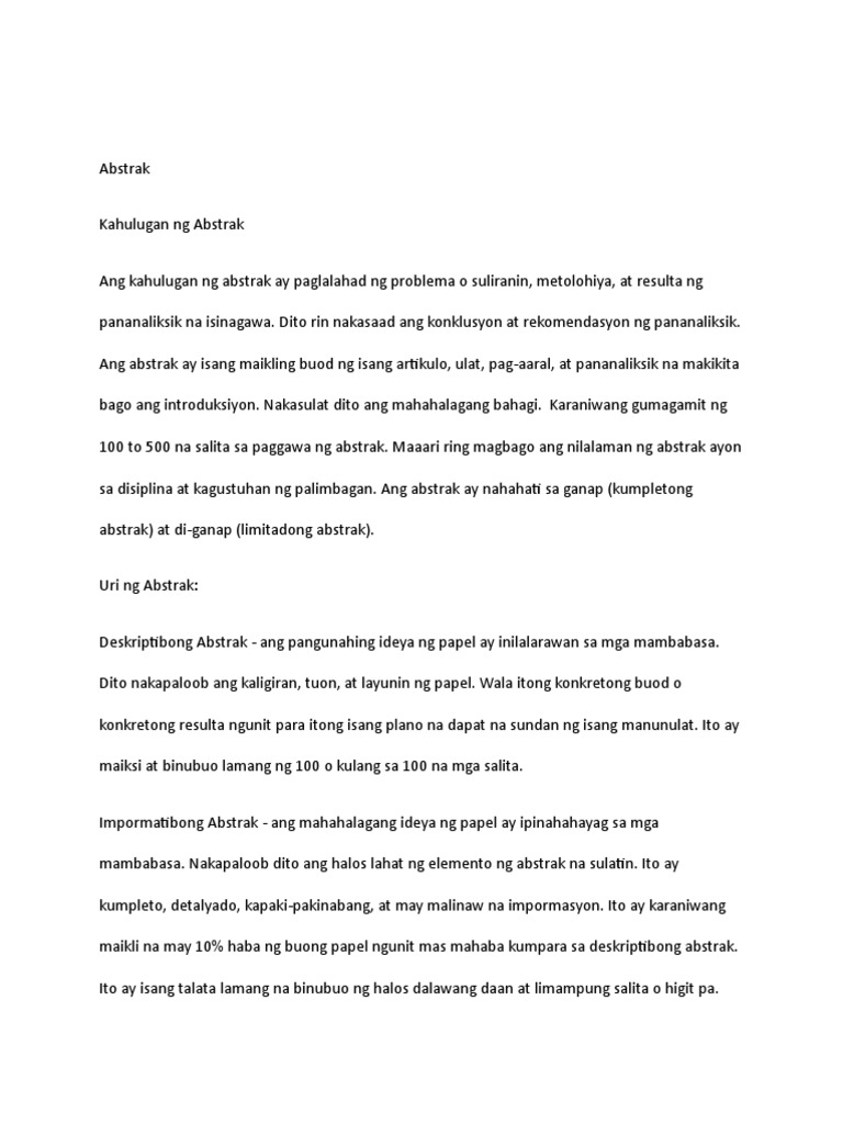 Nakapaloob dito ang kaligiran Binubuod dito ang kaligiran layunin at tuon ng papel o layunin tuon metodolohiya artikulo. Deskriptibong Abstrak Naglalaman ito ng suliranin at layunin ng pananaliksikmetodolohiyang ginamit at saklaw ng pananaliksik ngunit hindi tinatalakay ang resultakonkluyson at mga naging rekomendasyon ng pagaaral. Impormatibong Abstrak Binubuod dito ang kaligiran layunin tuon metodolohiya resulta at kongklusyon ng papel o artikulo Ipinahahayag ang mahahalagang ideya ng papel.
