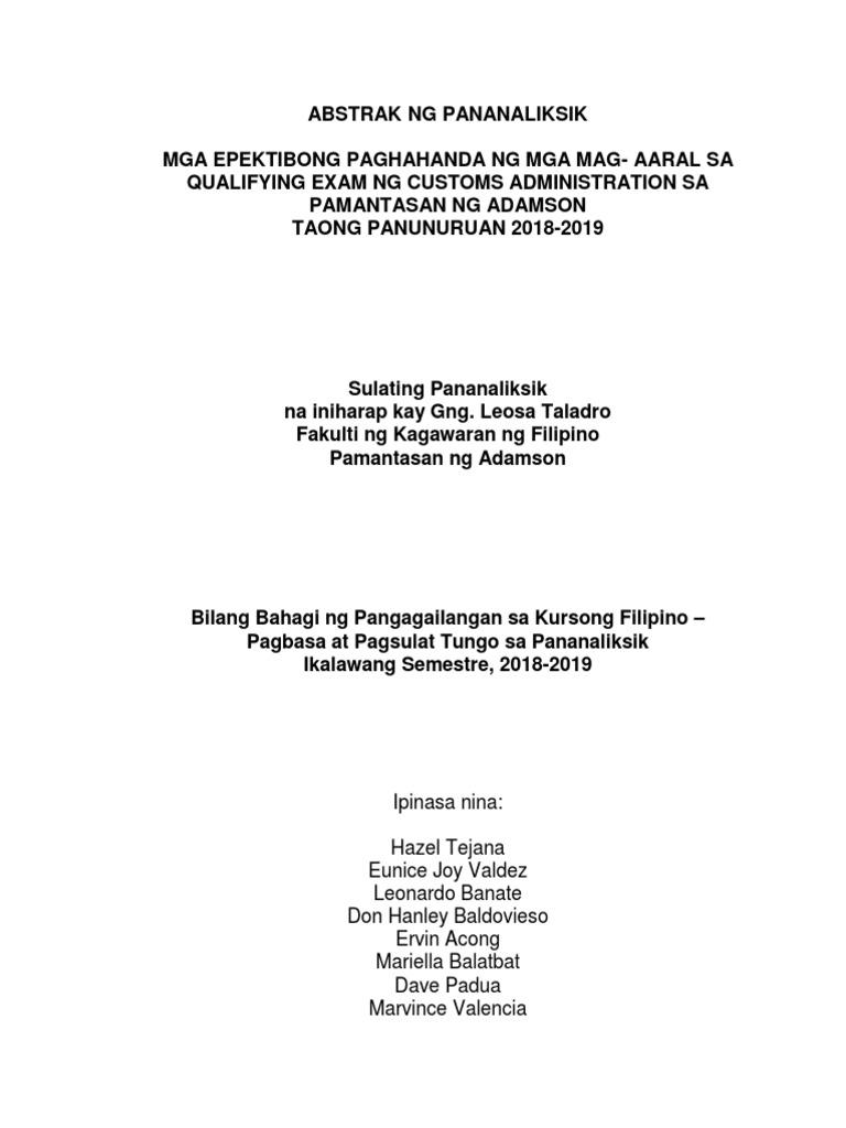 Hangad ng papel na ito na maipakita ang malaking maiaambag ng wikang Filipino sa pagpapayaman ng kultura ng pananaliksik sa loob ng mga institusyong Pilipino sa mataas na edukasyon na sa kalaunan ay mag-aangat sa kanilang katayuan sa ilang Asyano at pandaigdigang ranking ng mga pamantasan. View ABSTRAK 1pdf from BUSINESS 101 at Batangas Eastern Colleges. Nakapagpapahayag ng saloobin batay sa binasang teksto a3.