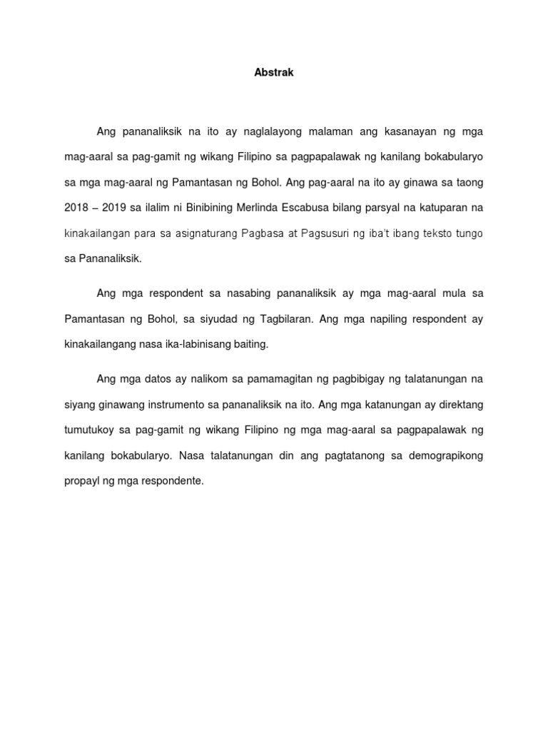 Ang abstrak ay dapat magsimula sa isang maikli ngunit tumpak na pahayag ng isyu na sinusundan ng isang paglalarawan ng pamamaraan ng pananaliksik at disenyo ang mga pangunahing natuklasan at naabot na ang konklusyon. Ang Suliranin at ang Kaligiran nito By Group III. ABSTRAK Ang layunin ng pananaliksik na ito ay upang malaman ang kalagayan ng wikang Filipino sa makabagong panahon ng mga estudyante ng ikalabing -isang taon ng St.