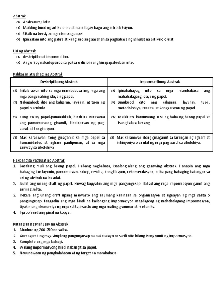 Hindi gaanong mahaba organisado ayon sa pagkakasunod sunod ng nilalaman. Ano- ano ang mga katangian ng sulating ito. Layunin ng abstrak na mapaikli o mabigyan ng buod ang mga akademikong papel gaya laman ng thesispananaliksik o journals.