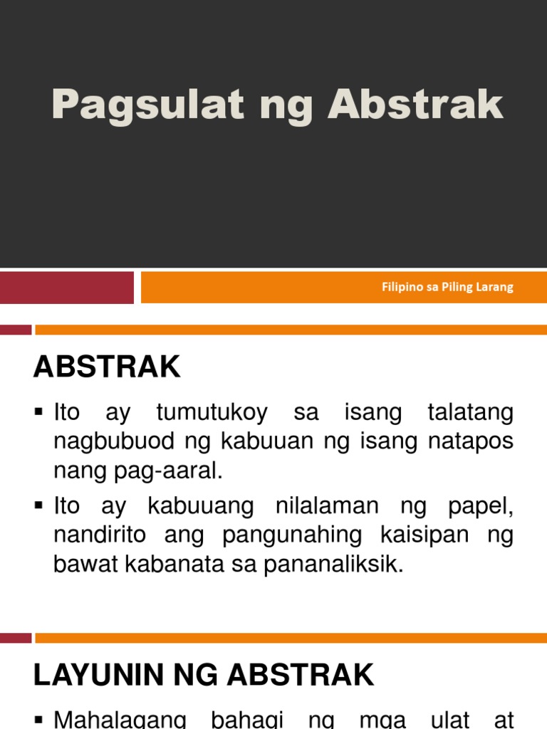 ABSTRAK Ito ay uri ng lagom na kadalasan ginagamit sa pagsusulat ng mga akademikong papel academic papers. Ito ay ginagamit sa pagsulat ng mga akademikong papel tulad ng tesis lektyur at ito ay kinakapalooban ng introduksyon metodolohiya resulta at kongklusyon. Akademikong sulatin layunin at gamit katangian.