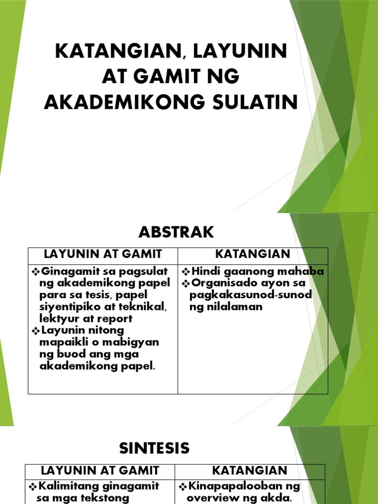URI NG AKADEMIKON G SULATIN ABSTRAK LAYUNIN AT GAMIT. Ang layunin nito ay makapagbigay impormasyon sa isang bagay na pinagaralan na. Akademikong sulatin layunin at gamit katangian.