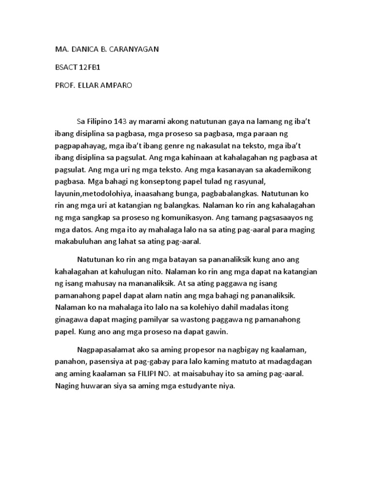 Mahalagang Natutunan Sa Akademikong Sulatin. Sa buhay at sa pagiging Pilipino o pagkakaroon ko ng nasyonalismo. Kailangang nya itong samahan ng tiwala sasarili at paggawa.